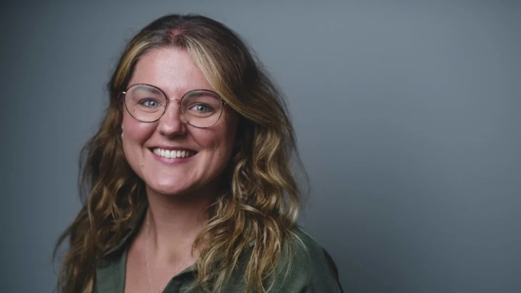 Harriet - Launch Paid media Director. Young Woman Smiling with glasses and curly blonde brown hair.
