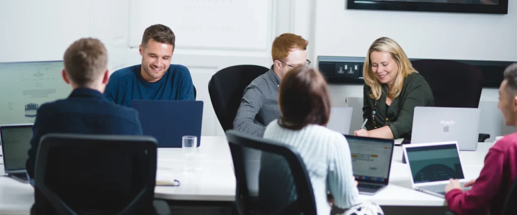 Launch team all sat around a large white desk, talking and looking at laptop screens