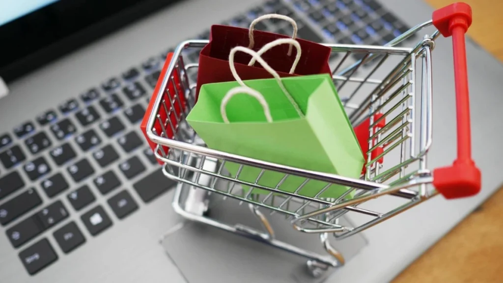 Mini shopping trolley filled with bags on top of a laptop to represent online shopping